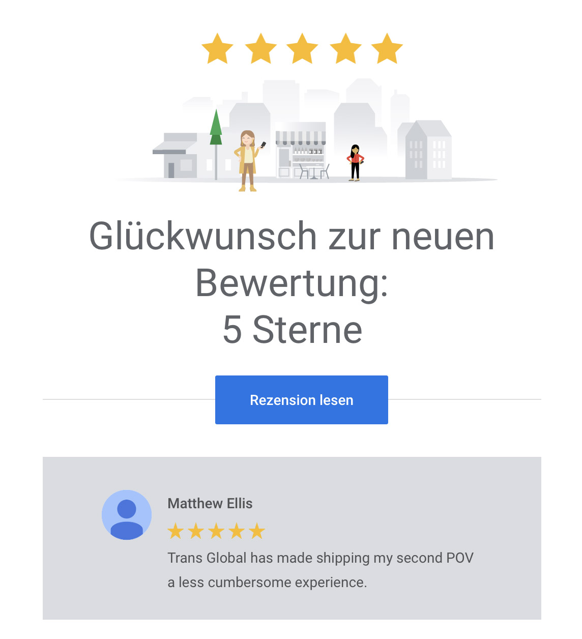 Illustration mit fünf gelben Sternen über einem Stadtbild und zwei gezeichneten Personen. Darunter steht: Glückwunsch zur neuen Bewertung: 5 Sterne. Ein blauer Button mit der Aufschrift Rezension lesen. Weiter unten ein grauer Kasten mit einem Avatar, dem Namen Matthew Ellis, und einer 5-Sterne-Bewertung mit Kommentar.